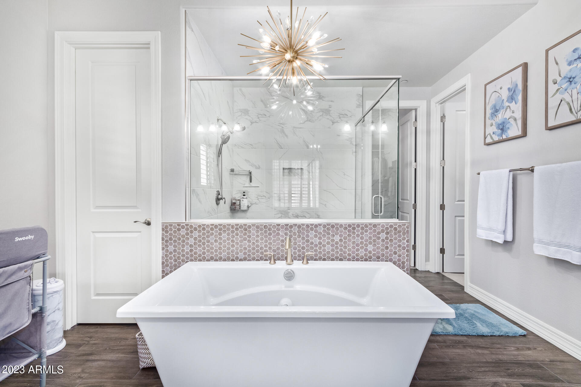 Pride of ownership is shown in this stunning residence in Vistancia! Fall in love with an enchanting open layout showcasing fresh soothing palette, tile flooring, dazzling light fixtures, & multi-sliders merging the indoor/outdoor activities. The gorgeous chef's kitchen features staggered white shaker cabinets adorned w/crown moulding, speckled granite counters, stylish tile backsplash, a wall oven, sparkling SS appliances, a walk-in pantry, & an island w/a convenient breakfast bar. Semi-open den is perfect for an office, formal dining, or a game area! Main retreat enjoys a lavish ensuite w/dual vanities, a delightful soaking tub, & a walk-in closet. Host memorable gatherings in the wonderful backyard showcasing artificial turf, a covered patio & a crystal-clear swimming pool! Must see!