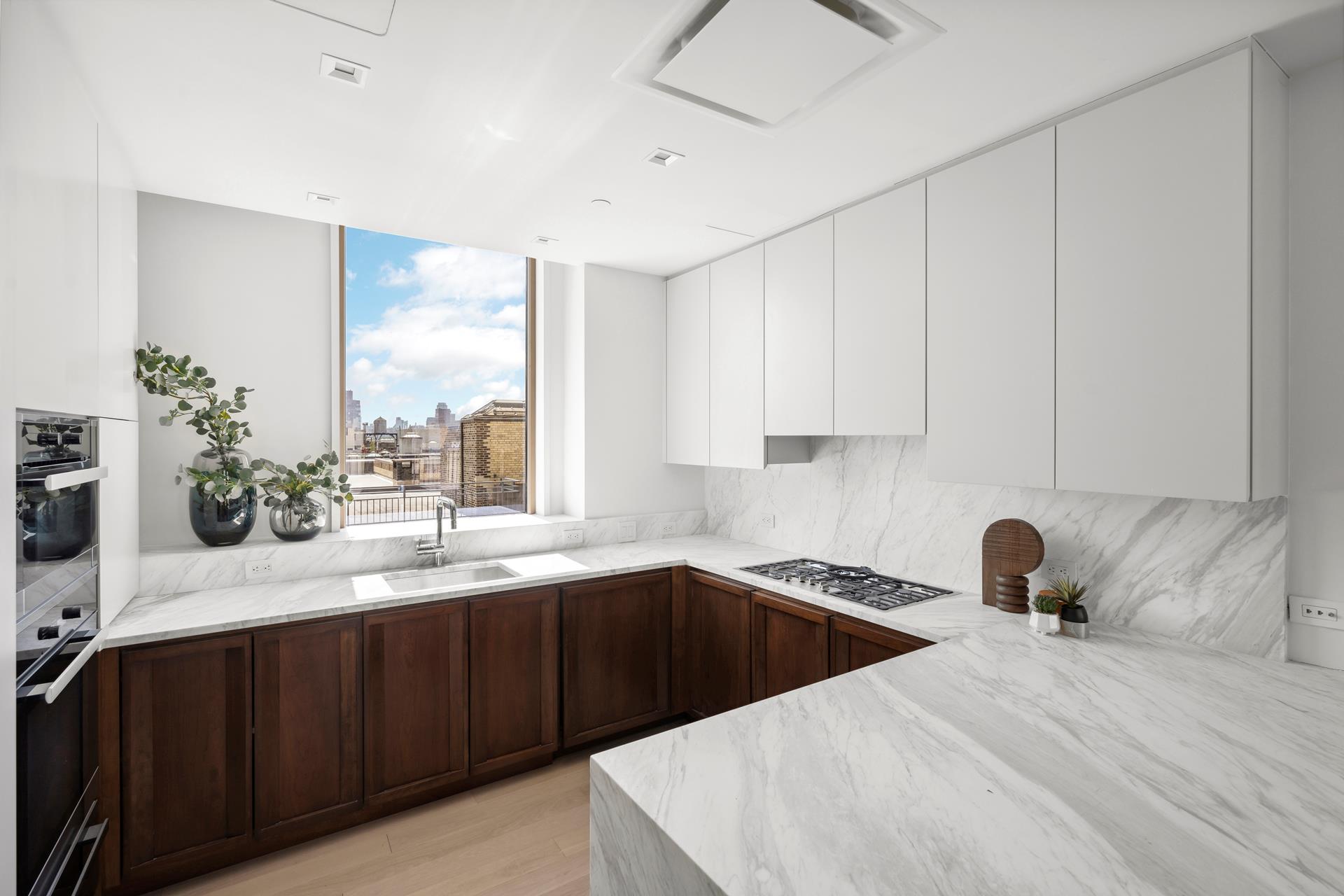 Upon the dedicated elevator entry, the gallery wall lends way to the light filled living and dining room. The chef's kitchen centers the home, featuring custom-stained wood and Ghiaccio grey lacquer cabinetry with bevel detailing, hand-selected European high-honed Volakas marble countertops and backsplash, and a best-in-class suite of Miele appliances with wine refrigerator.