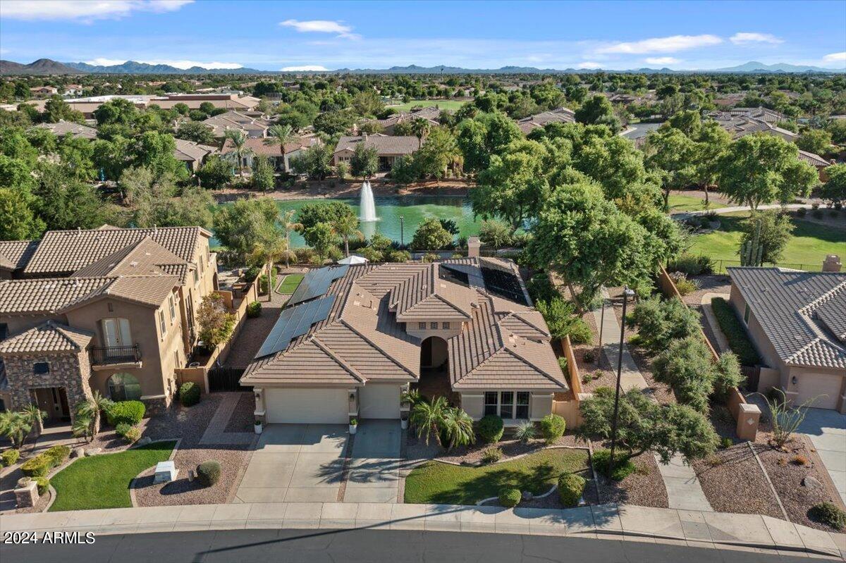 Situated on one of the most desirable lots in all of Valencia this exceptional 5-bedroom, 3.5-bathroom basement home offers the perfect blend of luxury, comfort, & eco-friendly living. Gorgeous wood-look tile, neutral paint, and stunning natural finishes - contemporary meets traditional in this TW Lewis quality home. Enjoyable from both inside & out, the lake with waterfall directly behind the home offers both privacy and serenity. The main level is designed with both style and functionality in mind. Including a modern kitchen with high-end appliances, huge breakfast bar, gas range, double ovens, built-in microwave, under cabinet lighting, & tons of counter/cabinet space. Suitable for entertaining or lazy evenings with the family the kitchen opens to the family room with gas fireplace. The living room is suited for entertaining with built-in bar and views of the stunning backyard accessible through the double slider doors - creating true indoor/outdoor living capitalizing on our gorgeous AZ weather. The primary suite serves as a peaceful retreat with a walk-in closet and a luxurious spa-like en-suite bathroom. The unique split floor plan basement features two generously sized bedrooms, a full bathroom, and a versatile flex roomideal for a home office, gym, or entertainment space or think multi-generational living! Step outside to enjoy your private backyard oasis, complete with a sparkling pool, large covered patio, artificial grass, & tons of pavers - a welcome retreat for your morning coffee or a glass of wine in the evening. The property also boasts pre-paid solar ensuring low electric bills for years to come.