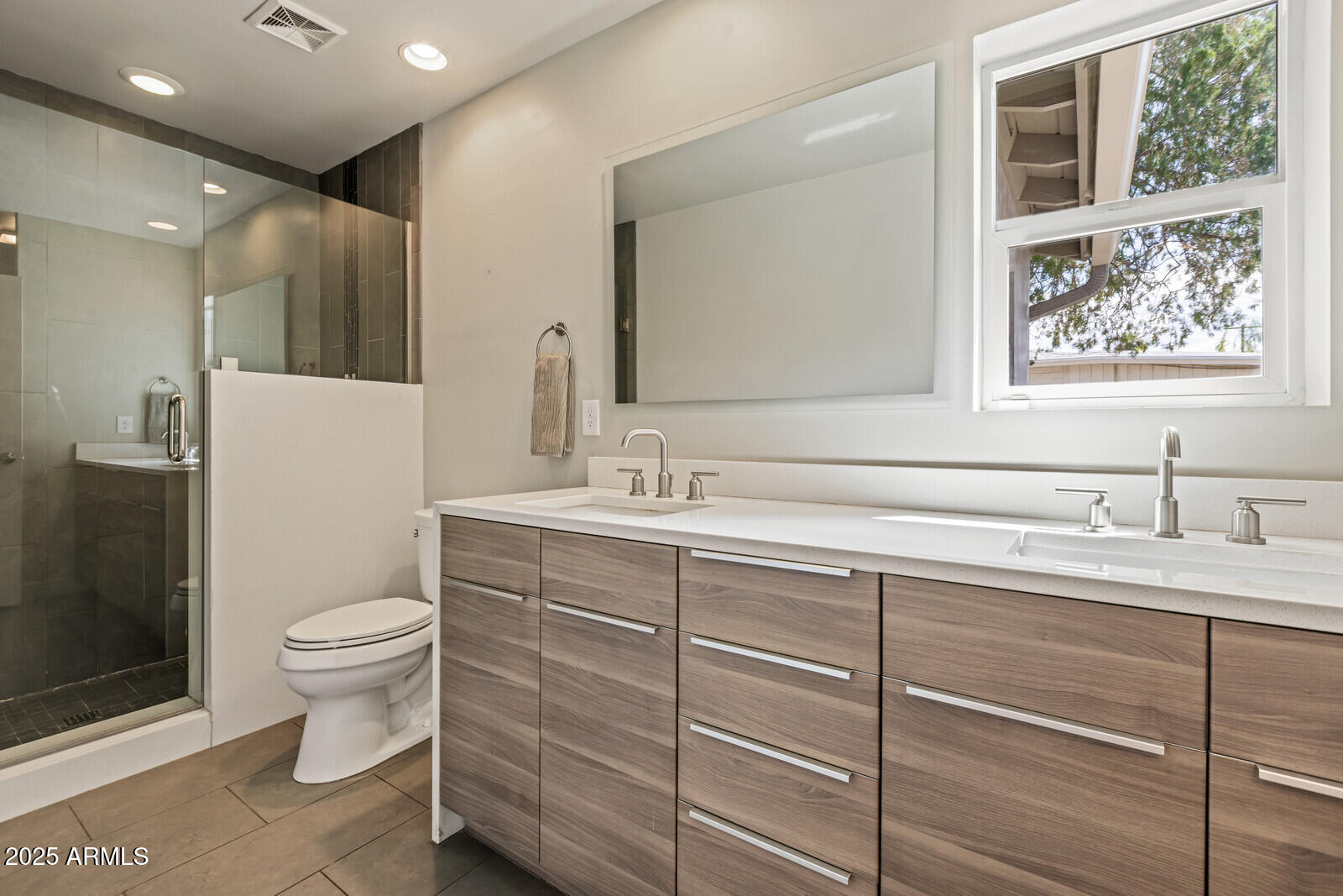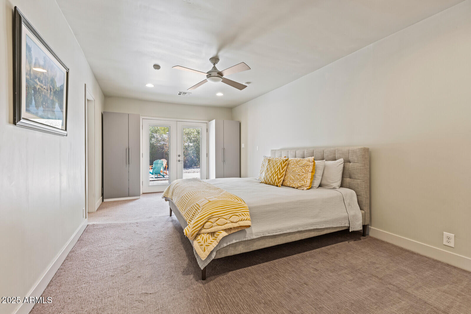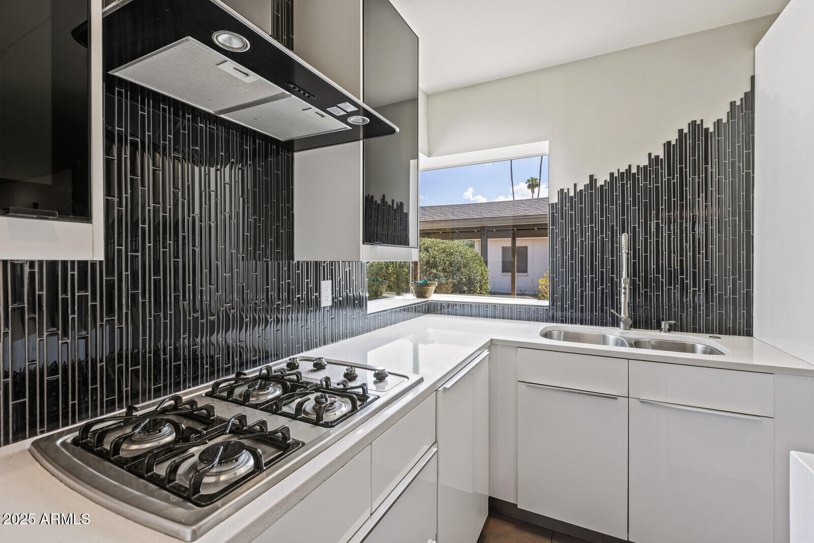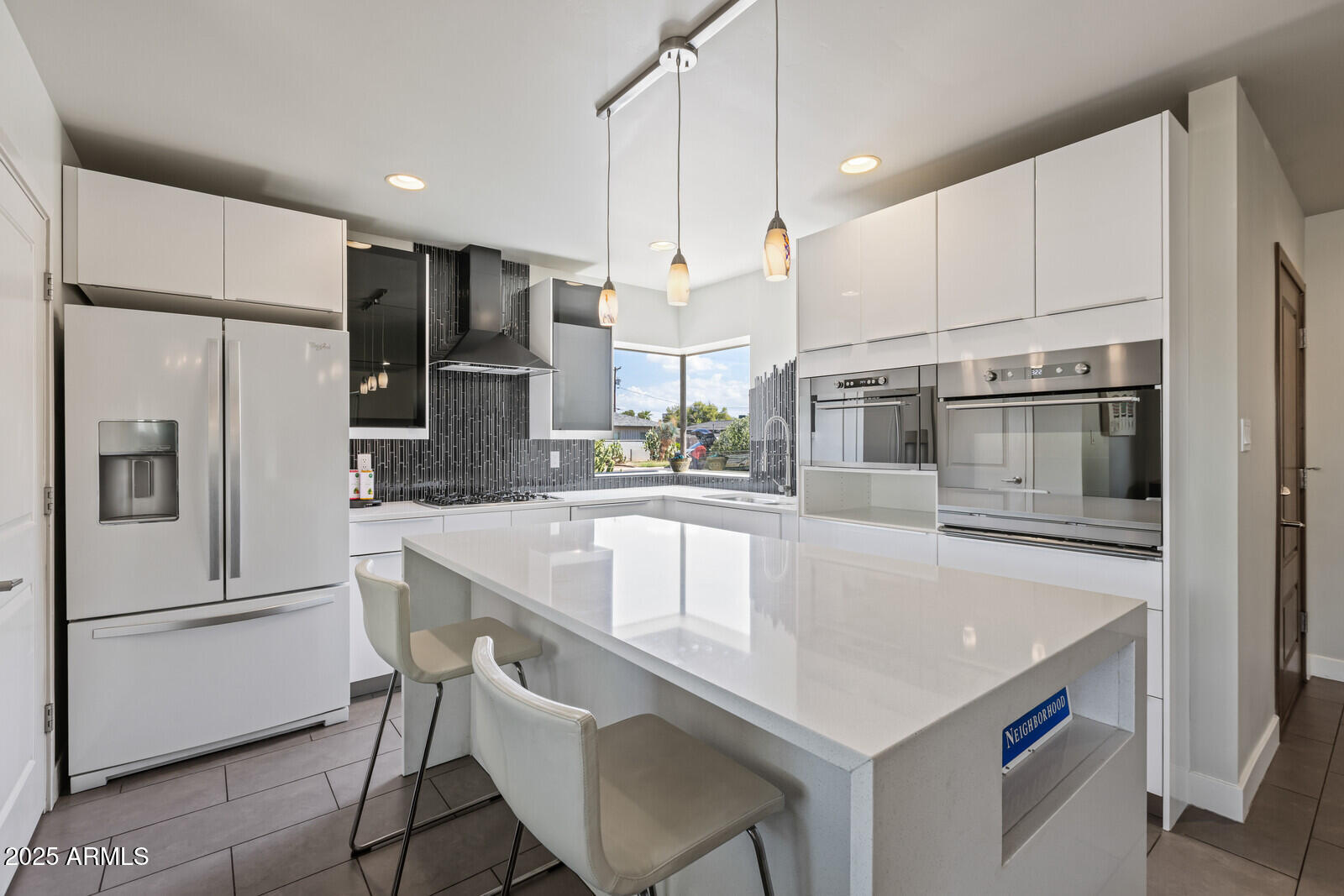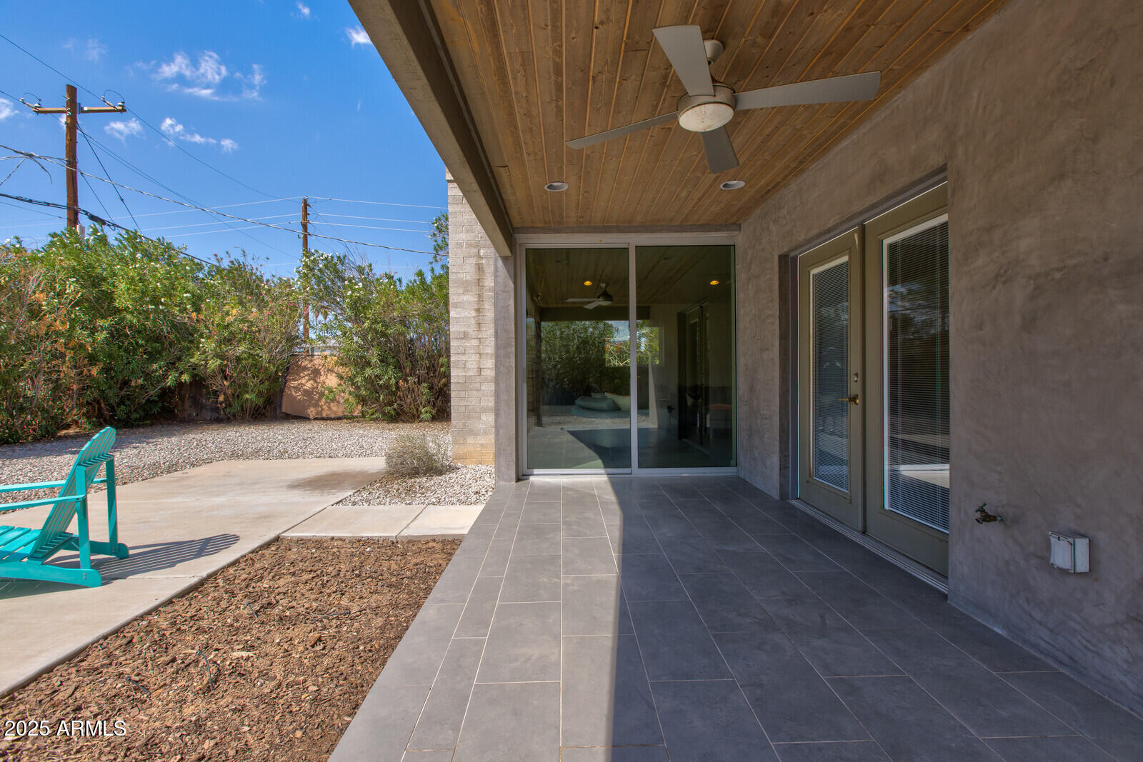 Gorgeous contemporary remodel with more upgrades than can be listed: sand-blasted brick with hard trowel finish exterior, Santa Fe smooth interior walls, new 2-panel interior doors with updated hardware, Aleutian White natural quartz counters, stainless steel appliances, glass tile backsplash, and high-gloss finish cabinetry. Inside, you'll also find indoor laundry, a gas tankless water heater, 12''x24'' porcelain tile throughout with new carpet in all three bedrooms, recessed can lighting, ceiling fans with remotes, and dual-pane windows. A vaulted living room ceiling and Heritage collapsible arcadia pocket door create seamless indoor/outdoor living, opening to a patio finished with matching tile, tongue-and-groove rough sawn wood ceilings, and exposed beams. The spacious primary suite features French doors, a walk-in closet, and additional built-in storage.