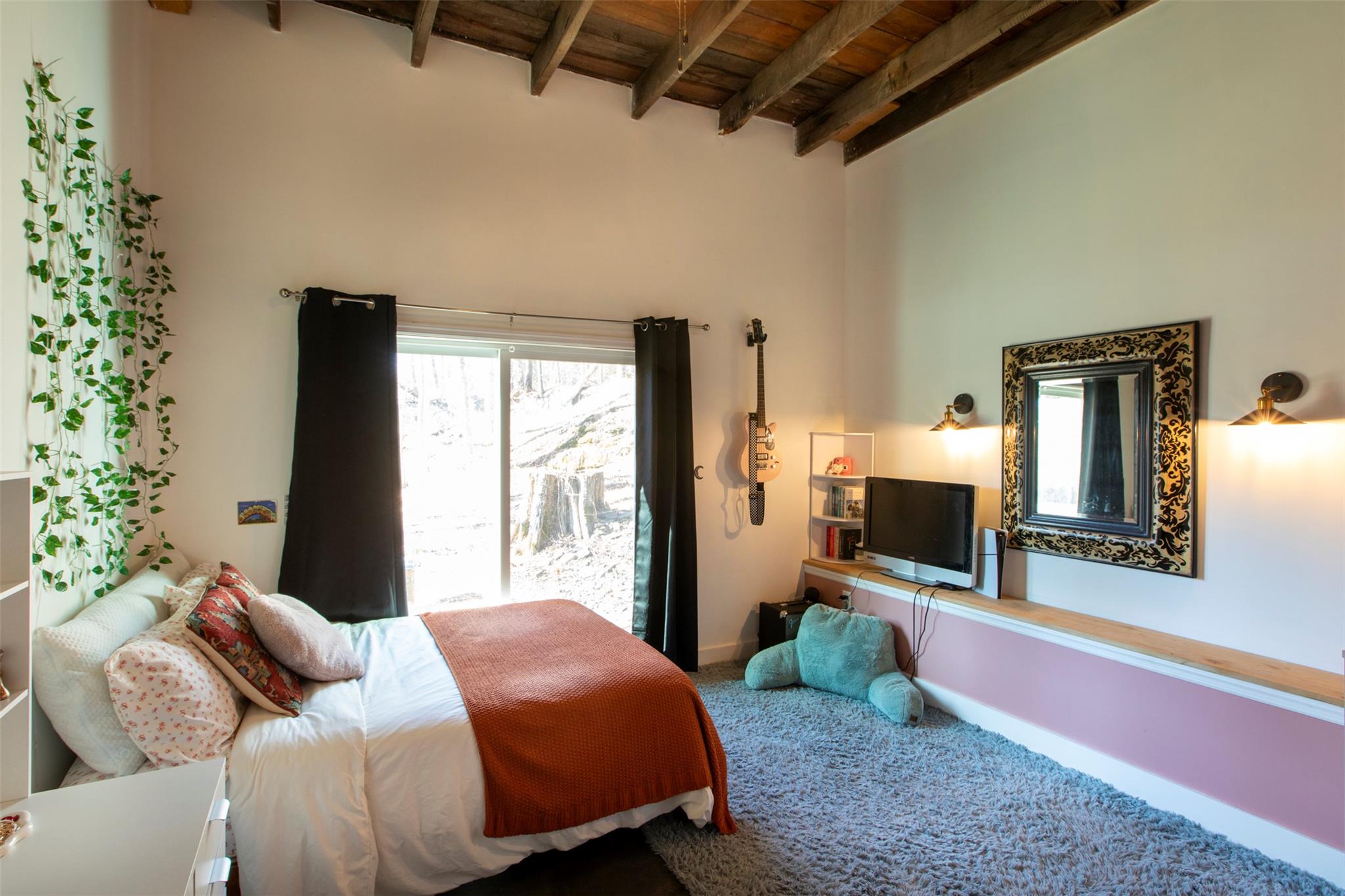 A bridge from the upper lot leads to the barn's stunning second level--another expansive post-and-beam space currently used for massage therapy and musical experiences. This floor also includes a full bathroom, a mechanical room, and a versatile extra room perfect for an office or additional sleeping area.