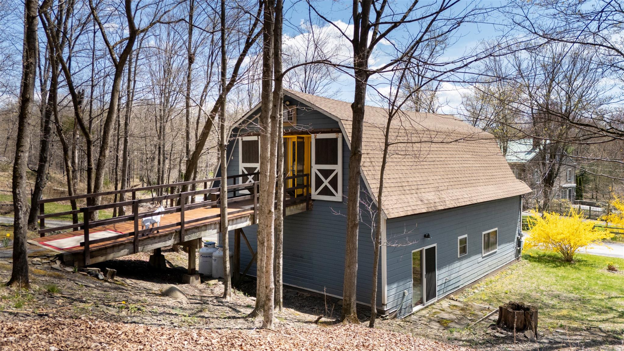 Beyond the barn, the property offers a range of additional spaces. A rustic treehouse adds a whimsical retreat, while a tiny cabin provides even more possibilities as a writer's shed, studio, or guest space.